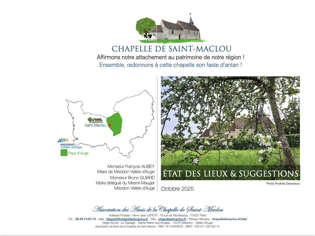 Dans le verger de la chapelle de Saint-Maclou, accrochées sur de frêles branches dénudées, quelques pommes font de la résistance. Frangilisées avec le temps qui a passé depuis leur apparition, elles sont à la merci d’un coup de vent pour finir à terre dans l’herbe fraiche comme leurs congénères. Mais puisque le cycle de la nature est immuable, au printemps prochain elles réapparaitront sous forme de fleurs…Ce dossier État des Lieux & Suggestions a été présenté le 17 novembre 2025 à Messieurs François Aubey, maire de Mézidon-Vallée-d’Auge, et Bruno Guiard, maire délégué du Mesnil-Mauger.