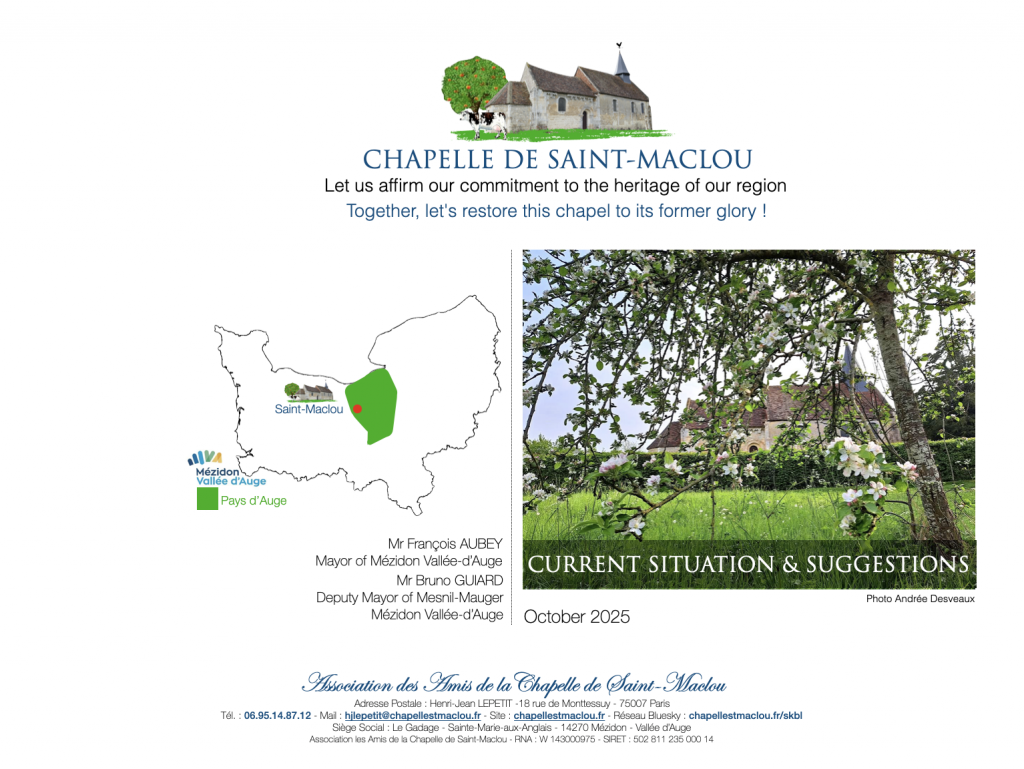 In the orchard of the Saint-Maclou chapel, clinging to slender, bare branches, a few apples are holding out. Weakened by the passage of time since they first appeared, they are at the mercy of a gust of wind, destined to fall to the ground in the fresh grass like their kin. But since the cycle of nature is immutable, next spring they will reappear as blossoms…This Inventory & Suggestions report was presented on November 17, 2025, to Mr. François Aubey, Mayor of Mézidon-Vallée-d’Auge, and Mr. Bruno Guiard, Deputy Mayor of Le Mesnil-Mauger.